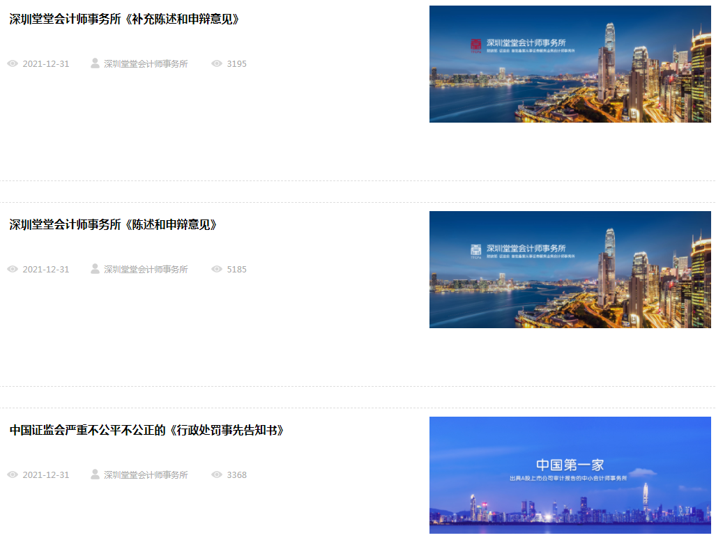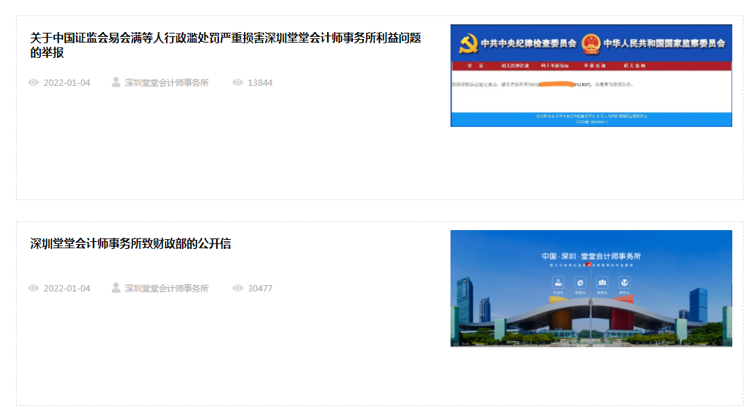 值得一提的是,1月4日,堂堂所在官网上再次发布了《深圳堂堂会计师事务所致财政部的公开信》和《关于中国证监会易会满等人行政滥处罚严重损害深圳堂堂会计师事务所利益问题的举报》。