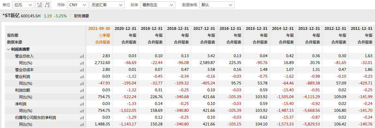 Wind资料显示,2018年至2020年,*ST新亿营收分别为0.13亿元、0.10亿元、0.03亿元,同比(与去年同期相比)分别下滑96.08%、22.44%、66.69%。