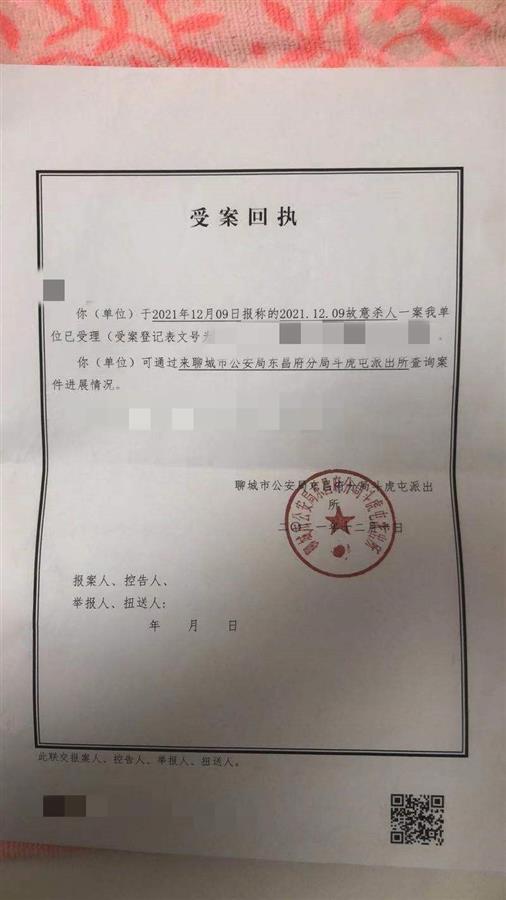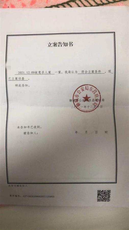 立案告知书显示,聊城市公安局东昌府分局已于2021年12月10日对此事立案侦查。极目新闻记者注意到,该案在立案通知书上的案名为“12.09故意杀人案”。