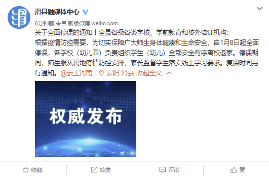 据滑县融媒体中心官方微博1月8日消息,根据疫情防控需要,为切实保障广大师生身体健康和生命安全,自1月8日起全面停课,各学校(幼儿园)负责组织学生(幼儿)全部安全有序离校返家。停课期间,师生服从属地疫情防控安排,家长监督学生落实线上学习要求。复课时间另行通知。