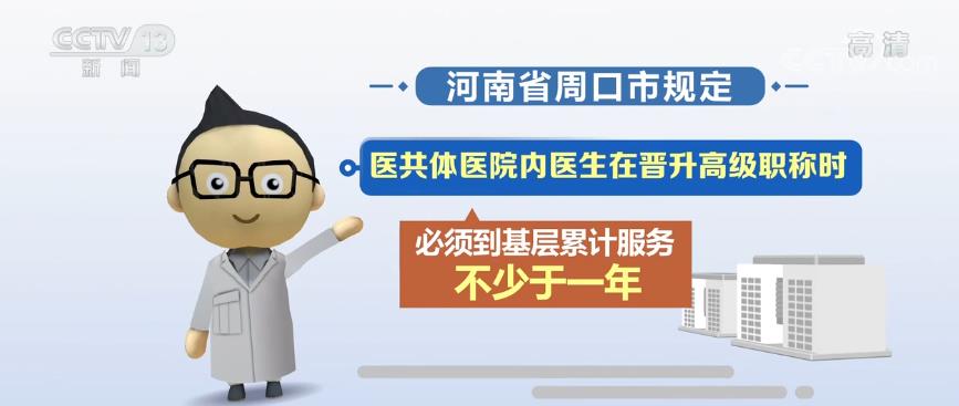 为鼓励医务人员下基层,河南省周口市规定,医共体医院内医生在晋升高级职称时,必须到基层累计服务不少于一年;安徽省濉溪县医院建立医共体运营奖补专项资金,用于医生下基层的奖励补助和分院院长奖励性绩效。