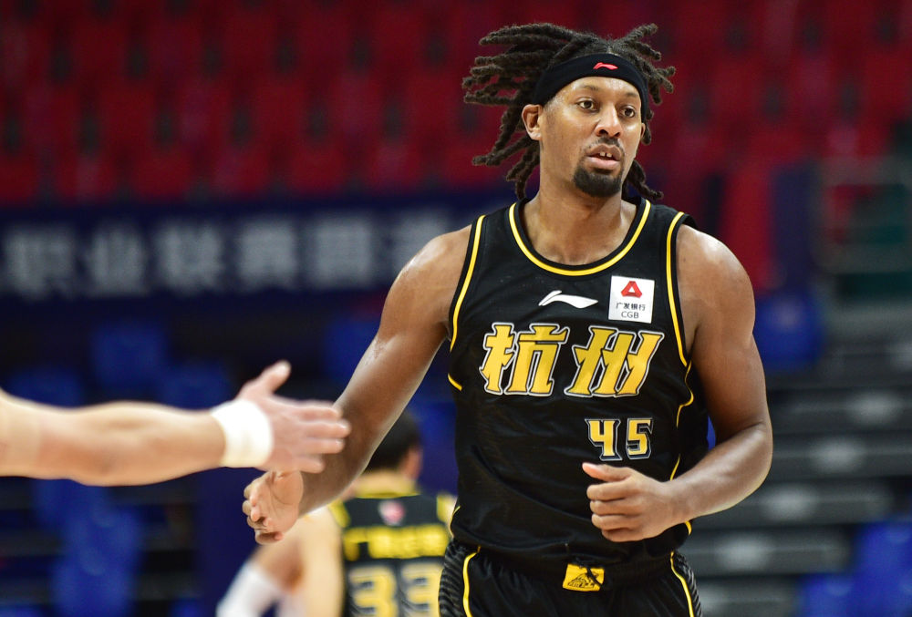1月6日,浙江广厦控股队球员琼斯在对阵深圳马可波罗队的比赛中与队友击掌庆祝得分。新华社记者林宏摄
