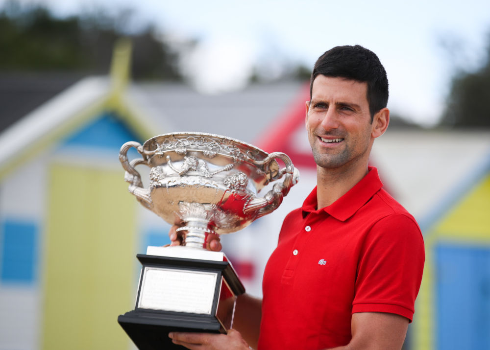 2021年2月22日,焦科维奇获得2021年澳大利亚网球公开赛男单冠军,在墨尔本布赖顿海滩展示奖杯。新华社发(胡泾辰摄)