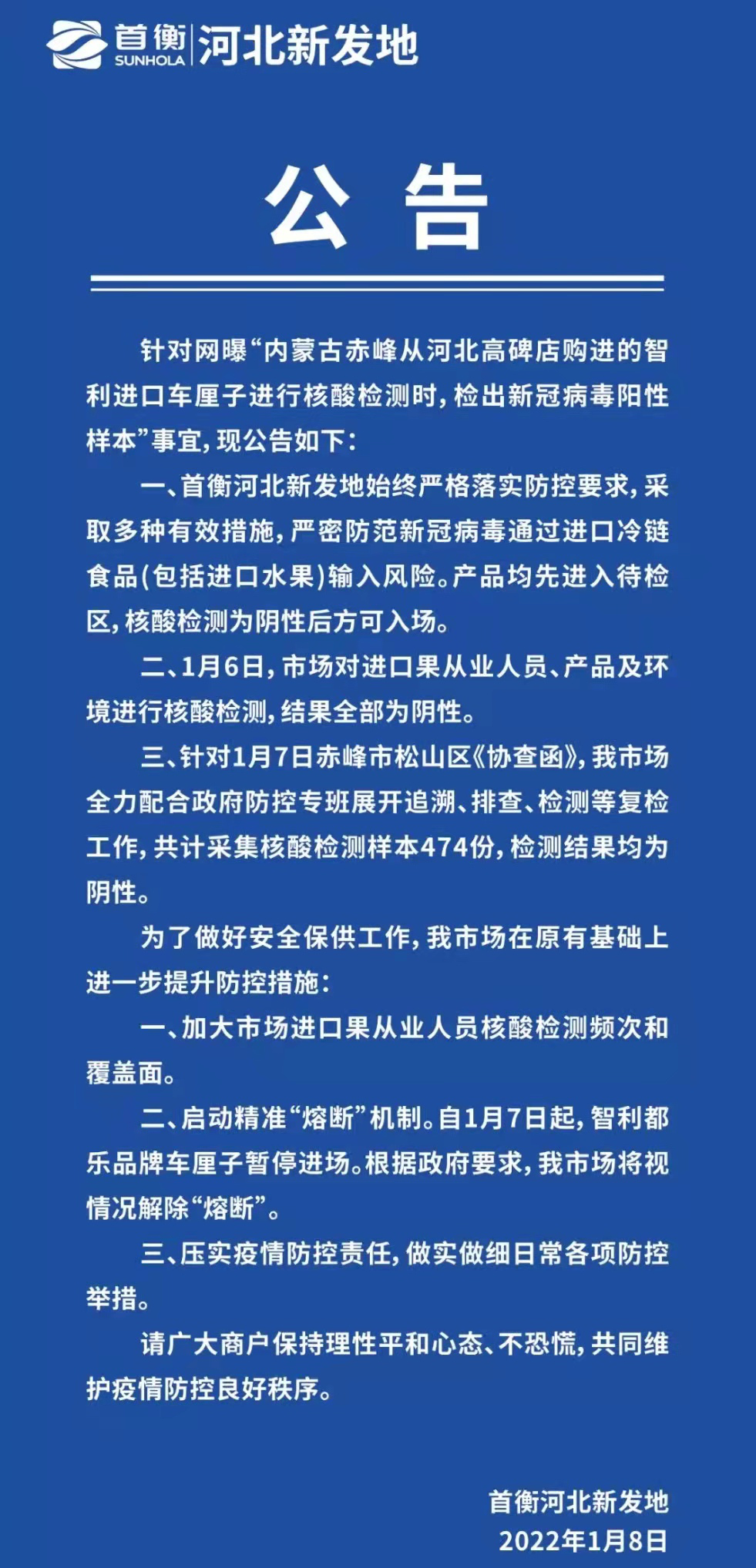 央视网消息(记者 徐辉)1月8日,首衡河北新发地发布公告,针对“内蒙古赤峰从河北高碑店购进的智利进口车厘子进行核酸检测时,检出新冠病毒阳性样本”事宜,首衡河北新发地市场对进口果从业人员、产品及环境进行核酸检测,结果全部为阴性。市场已启动精准“熔断”机制,自1月7日起智利都乐品牌车厘子暂停进场。