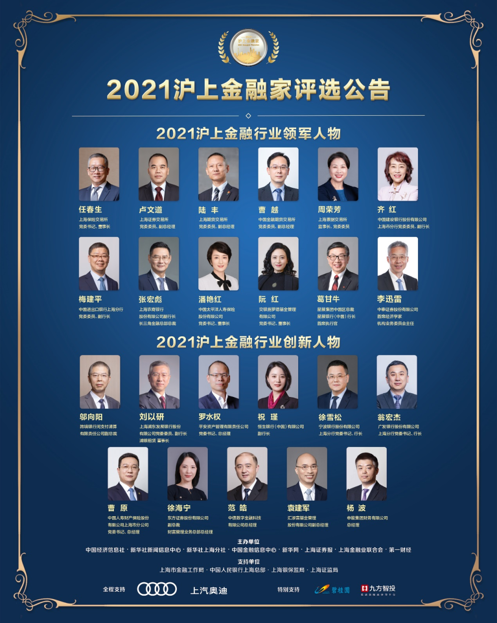 据悉,2021“沪上金融家”活动由新华社中国经济信息社、新华社新闻信息中心、新华社上海分社、中国金融信息中心、新华网、上海证券报、上海金融业联合会、第一财经主办,上海市金融工作局、中国人民银行上海总部、上海银保监局、上海证监局支持。上汽奥迪提供全程支持,碧桂园、九方智投特别支持。评选活动在2021年8月正式启动,获奖榜单经申报推荐、推举委员会提名、资格审核、媒体评审、网络投票、专家评审等流程产生。