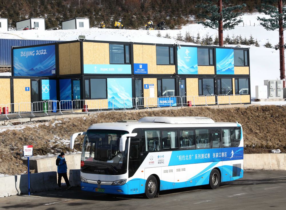 张家口市崇礼云顶滑雪公园,一名工作人员准备乘坐氢燃料大巴出行。新华社记者 杨世尧 摄