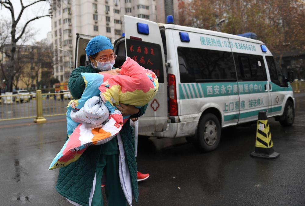 1月8日,在西安市莲湖区上和城小区,龙首西南社区安排专车接送患病居民(左)前往西安市中医医院就医。新华社记者 李一博 摄