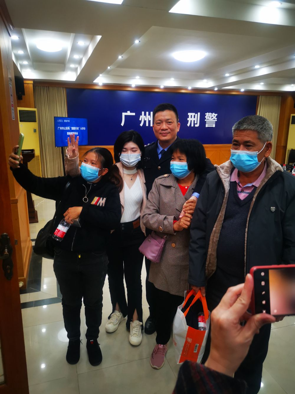 12月28日,在广州市公安局花都区分局刑警大队,罗艳(左五)一家人与办案民警合影留念。右三为刘彦佑。新华社记者邓华 摄
