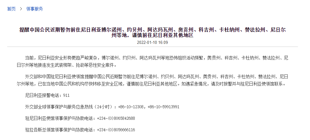 中国驻尼日利亚大使馆1月10日发布通告,提醒中国公民近期暂勿前往尼日利亚博尔诺州、约贝州、阿达玛瓦州、奥贡州、科吉州、卡杜纳州、赞法拉州、尼日尔州等地,谨慎前往尼日利亚其他地区。