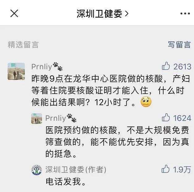 日前,深圳有位孕妇因情况特殊需要住院,但入院所需核酸检测报告还未出来。相关情况在深圳市卫健委微信公号上留言反映后,很快收到“电话发我”的回复。此后,经过深圳市卫健委的统筹协调,用了1个多小时就查到了核酸结果,孕妇得以顺利住院、及时治疗。