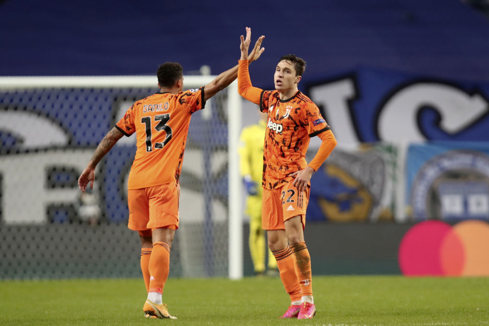 资料图:2021年2月17日,尤文图斯队球员基耶萨(右)进球后与队友达尼洛击掌庆祝。