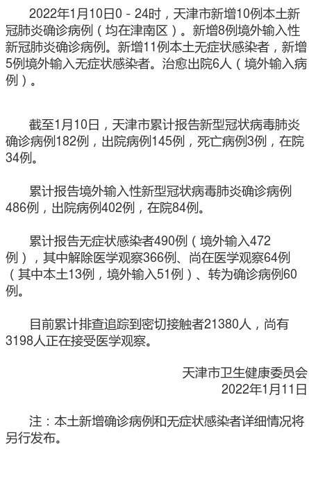 据天津市卫生健康委员会官方微博消息,天津10日新增10例本土确诊、11例本土无症状感染者。