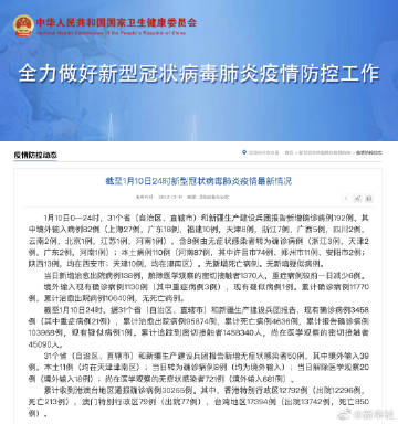 截至1月10日24时,据31个省(自治区、直辖市)和新疆生产建设兵团报告,现有确诊病例3458例(其中重症病例21例),累计治愈出院病例95874例,累计死亡病例4636例,累计报告确诊病例103968例,现有疑似病例1例。累计追踪到密切接触者1458340人,尚在医学观察的密切接触者45090人。