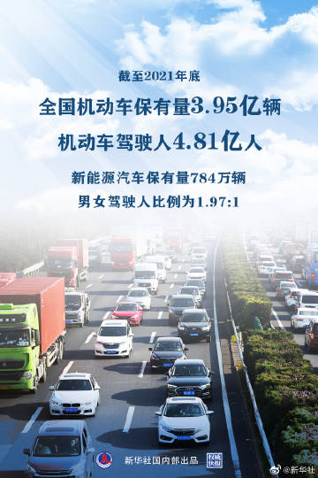 【#权威快报#|公安部发布2021年全国机动车和驾驶人数据】公安部1月11日发布2021年全国机动车和驾驶人数据。#全国机动车保有量达3.95亿辆#,其中汽车3.02亿辆。机动车驾驶人达4.81亿人,其中汽车驾驶人4.44亿人。新注册登记机动车3674万辆,同比增长10.38%。新能源汽车保有量达784万辆。男女驾驶人比例为1.97:1。全国79个城市汽车保有量超100万辆。(记者任沁沁、海报设计乔昕)