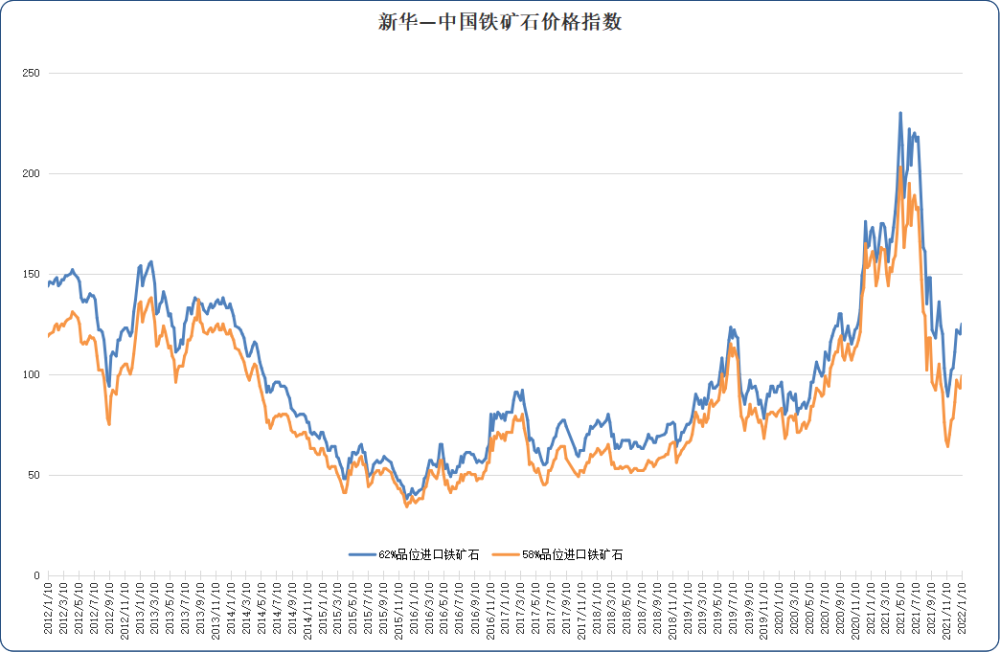 新华财经北京1月11日电(郑豪)新华—中国铁矿石价格指数显示,2022年1月4日至1月10日间,进口铁矿石价格偏弱运行。数据显示,1月10日,我国62%品位进口铁矿石价格指数为125,较1月3日上涨4.17%;58%品位进口铁矿石价格指数为99,较1月3日上涨6.45%。