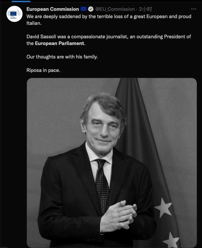 1月11日,欧洲议会、欧盟委员会等机构在社交媒体发布消息称,欧洲议会议长戴维·萨索利去世。当天,欧盟机构下半旗致哀。