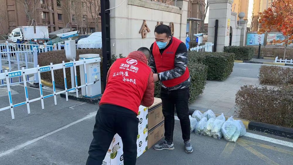 ↑1月10日,在天津市津南区咸水沽镇津南新城合畅园小区附近,物美超市工作人员在为居民运送生活物资。新华社发