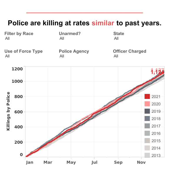 根据在线数据库“Mapping Police Violence”的统计,2021年美国至少有1124位平民因警察暴力执法而死。据《华盛顿邮报》估计,其中有888人死在警察的枪口之下。