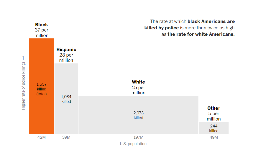 ↑美国非裔和西班牙裔被警察枪杀的比例均高于白人。