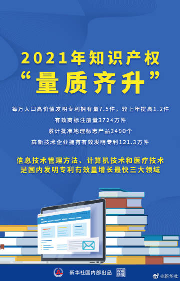 【权威快报|#2021年知识产权量质齐升#】国家知识产权局副局长、新闻发言人胡文辉12日在国新办新闻发布会上介绍,2021年我国知识产权工作“量质齐升”:高新技术企业有效发明专利121.3万件,体现出市场主体创新创造能力不断增强;全国专利商标质押融资金额3098亿元,普惠性凸显;信息技术管理方法、计算机技术和医疗技术是国内发明专利有效量增长最快三大领域,关键核心技术领域专利储备不断增强,更加有力支撑产业升级,更好惠及百姓生命健康。(记者王琳琳、宋晨,海报设计杨轶群)