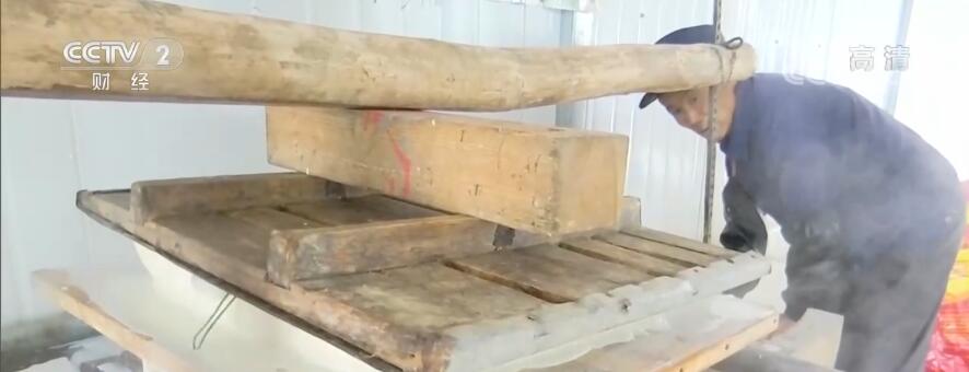 把磨好的豆浆倒进厨房的大铁锅中点火烧开,再用卤水点制,最后盛在铺着过滤布的大长木盒子里挤压成型后,一板豆腐就做成了。年前磨豆腐,来年更幸福。这是一种传统文化更是一道风趣年味。进入腊月,这家手工豆腐店每天的销量将近300斤。