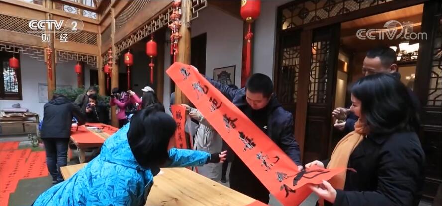 在安徽歙县的一家农家小院里,书法爱好者们聚集在一起,空地上铺满了刚刚写好的春联。这样手写的春联可以现场选择内容,更有一种私人订制的感觉。