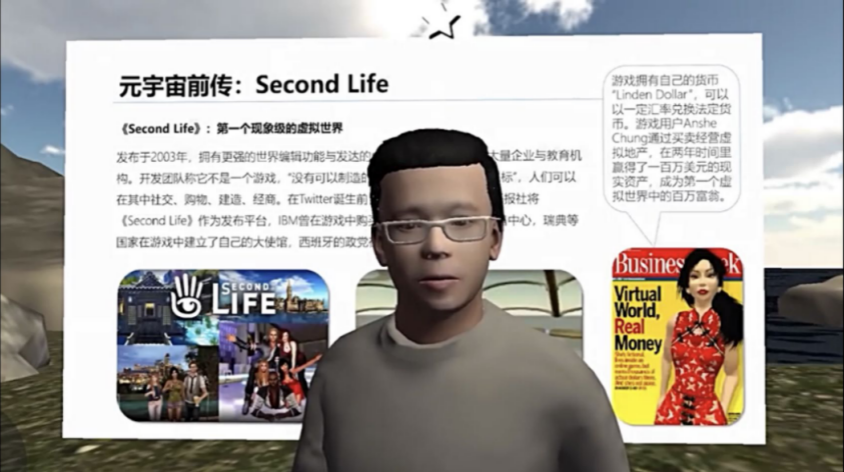 清华大学新闻与传播学院教授沈阳的虚拟人正在做关于元宇宙的演讲。受访者供图
