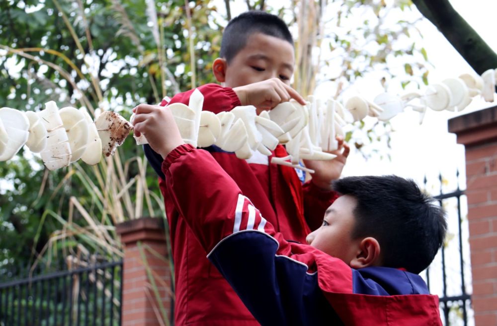 萝卜不仅是美食,还能做成艺术品。在另一个班级里,老师带着学生们做萝卜雕刻。孩子们开动奇思妙想,就地取材,用白萝卜、胡萝卜、紫萝卜搭配,雕刻拼贴出漂亮的图案。惟妙惟肖的小鸟、颜色绚烂的花朵……现场俨然成了一场小小的期末艺术作品展。