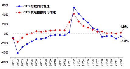 2021年12月,中国运输生产指数(CTSI)为159.1点,同比下降5.8%,两年平均增速下降4.8%。分结构看,CTSI货运指数为197.9点,同比增长1.9%,两年平均增速达到4.4%;CTSI客运指数为85.3点,同比下降30.1%,两年平均增速下降28.0%。