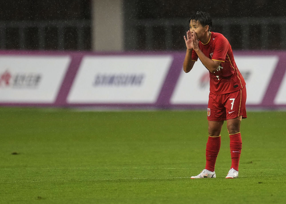 ↑ 2021年9月18日,联合队球员王霜在比赛落后时,呼喊队友。当日,在西安举行的第十四届全运会足球项目女子成年组小组赛A组比赛中,联合队以2比1战胜江苏队。