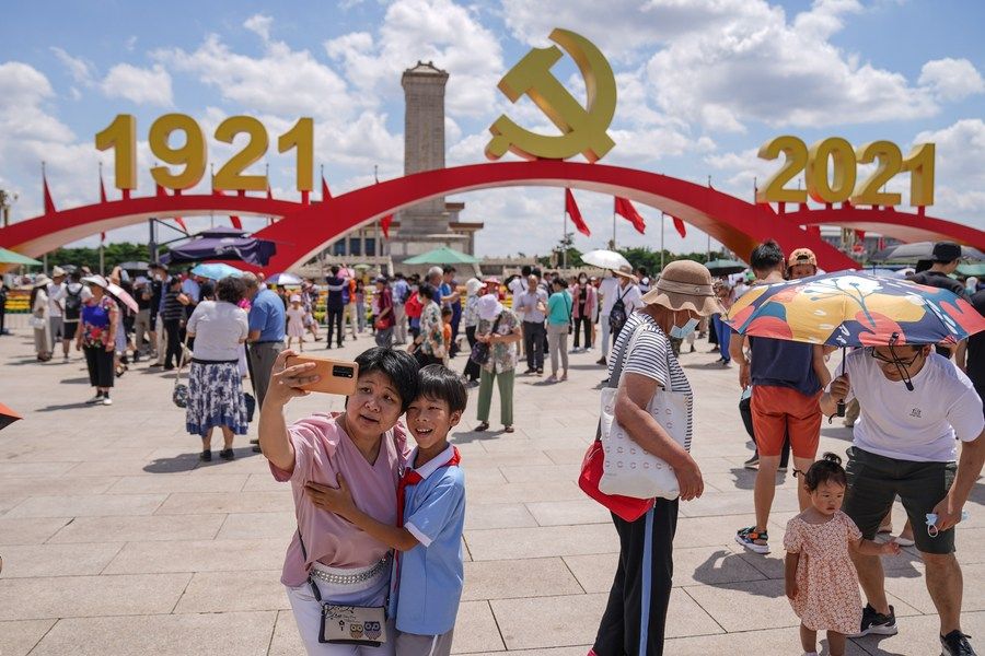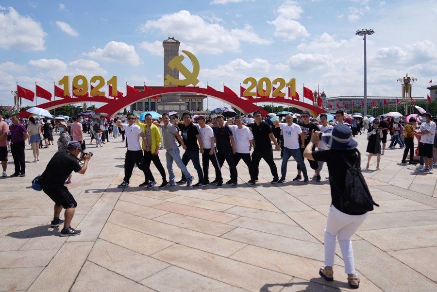↑ 2021年7月3日,天安门广场庆祝景观向公众开放,游客们在天安门广场拍照留念。