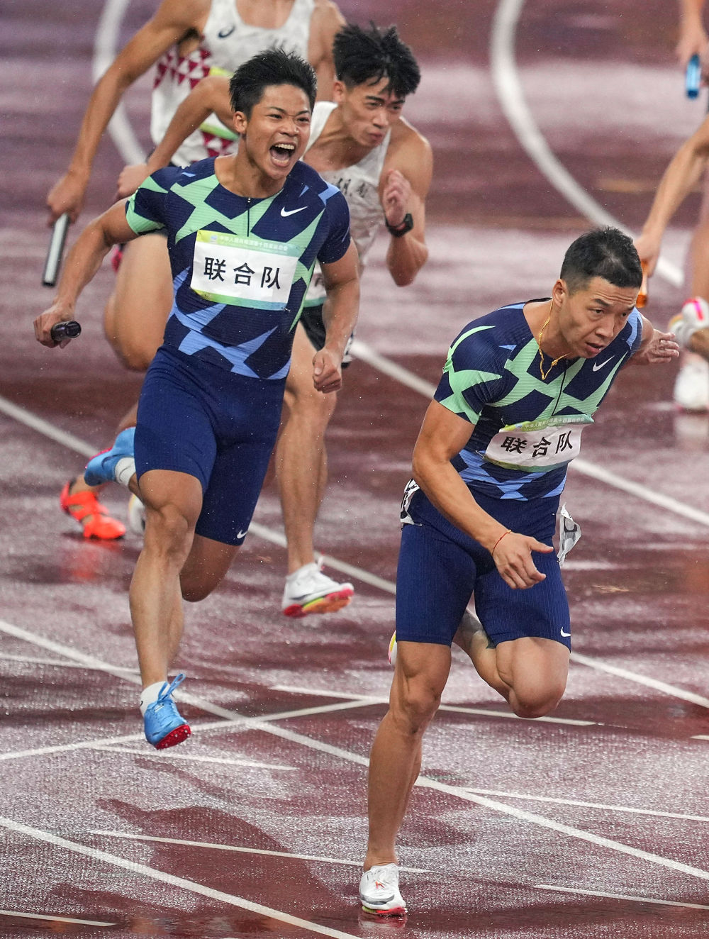 ↑ 2021年9月24日,联合队第三棒选手苏炳添(前左)和第四棒选手吴智强在比赛中交接棒。当日,第十四届全运会田径项目男子4x100米接力决赛在西安奥体中心举行,联合队以38秒50的成绩获得冠军。