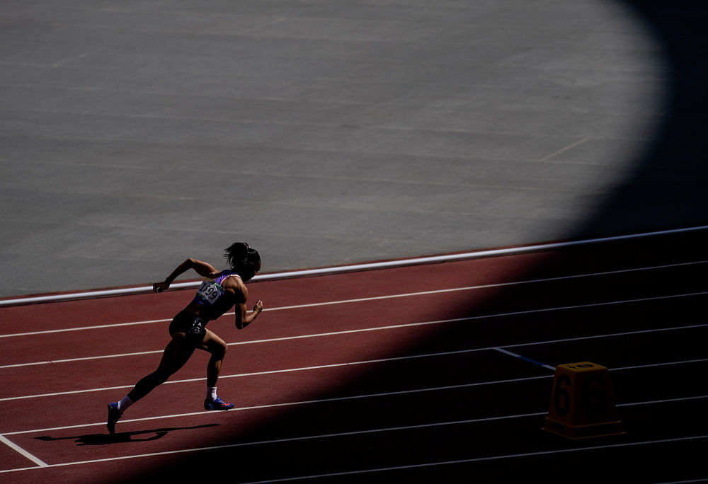 ↑ 2021年9月20日,重庆队选手吴晓露在田径项目女子400米预赛中。当日,第十四届全运会田径项目女子400米预赛在西安奥体中心举行。