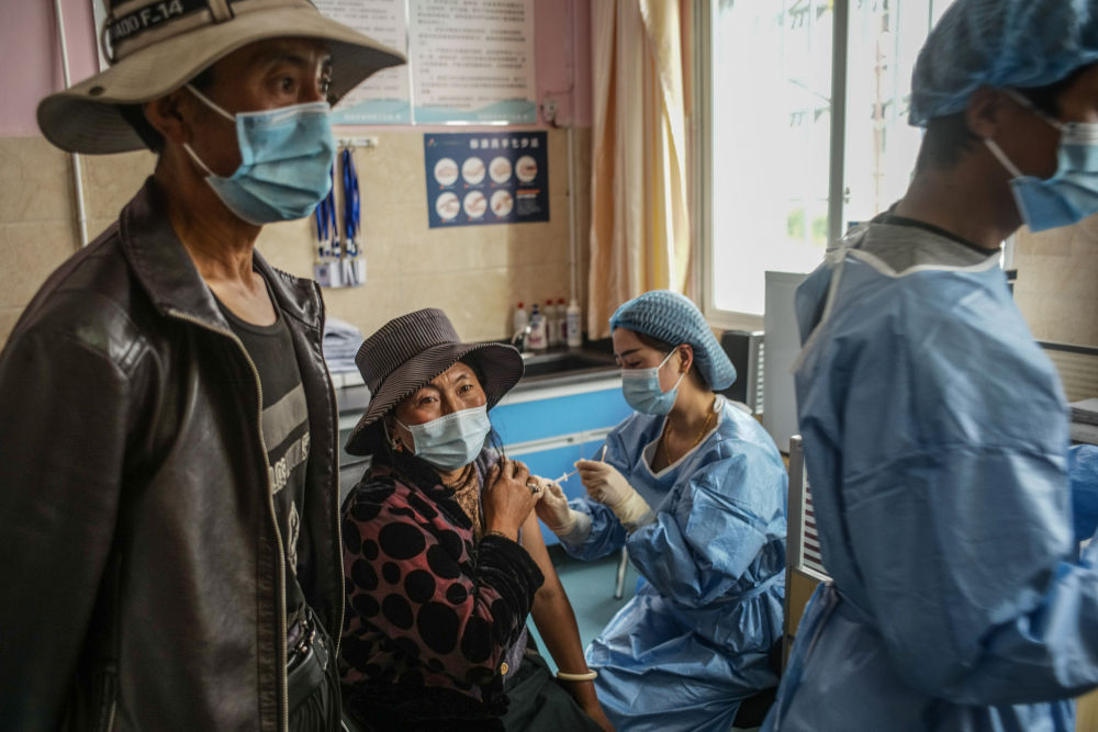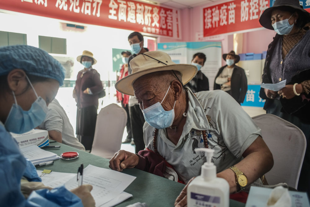 ↑ 2021年7月24日,在四川甘孜藏族自治州稻城县疫苗接种点内,当地群众在接种疫苗。