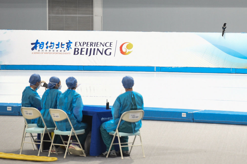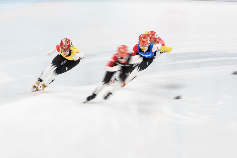 ↑ 2021年4月9日,运动员在“相约北京”冰上测试活动短道速滑比赛中。