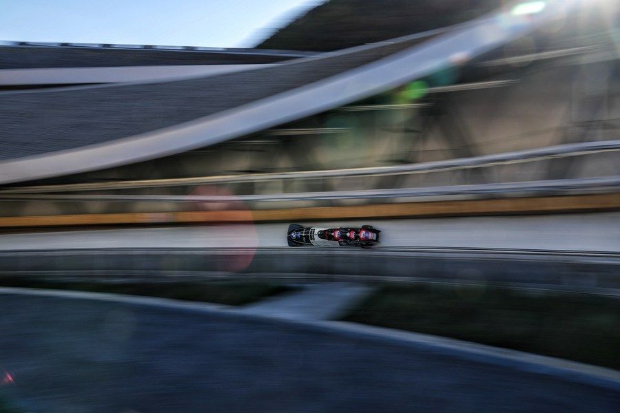 ↑ 2021年10月26日,瑞士选手迈克尔·福格特、阿兰·克努瑟、西里尔·比耶里、桑德罗·迈克尔在男子四人雪车比赛中。