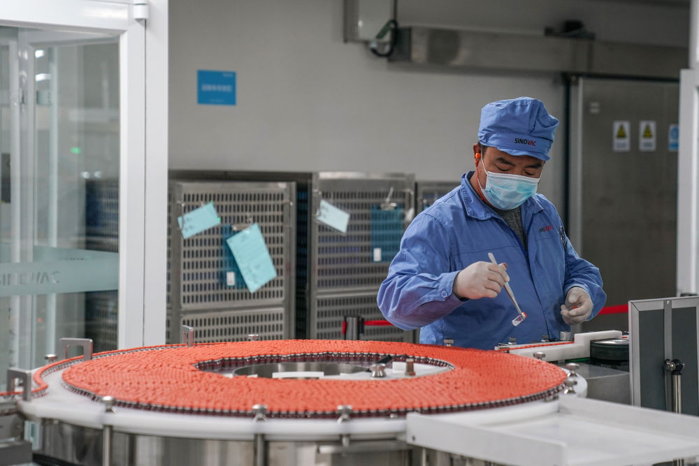 ↑ 2021年7月8日,工作人员在北京科兴疫苗生产流水线上工作。