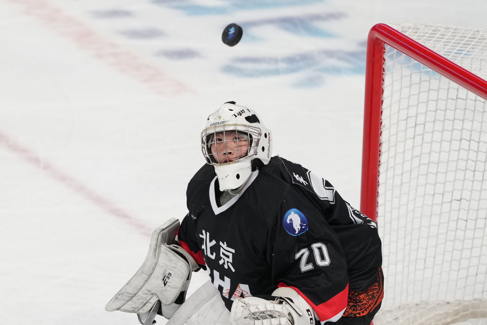 ↑ 2021年4月4日,冰球运动员在五棵松体育中心“相约北京”冰上项目测试活动中。
