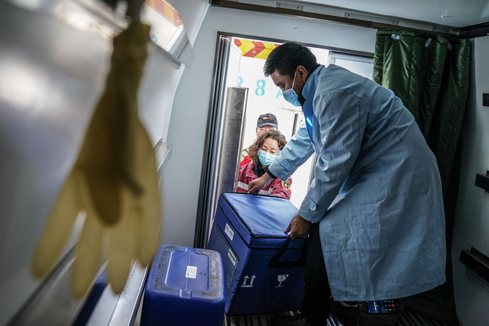 ↑ 2021年7月22日,在四川甘孜藏族自治州疾控中心,工作人员将疫苗搬入当地的冷链车。