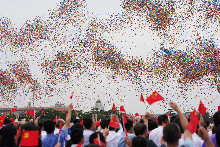 ↑ 2021年7月1日上午,庆祝中国共产党成立100周年大会在北京天安门广场隆重举行。这是庆祝大会现场气球腾空而起。