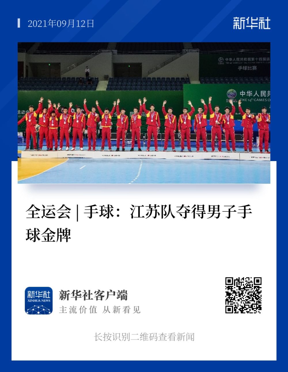 ↑ 2021年9月12日,江苏队球员谢庆龙赛后庆祝。当日,在西安举行的第十四届全运会男子手球决赛中,江苏队以22.5比21.5战胜北京队,夺得金牌。