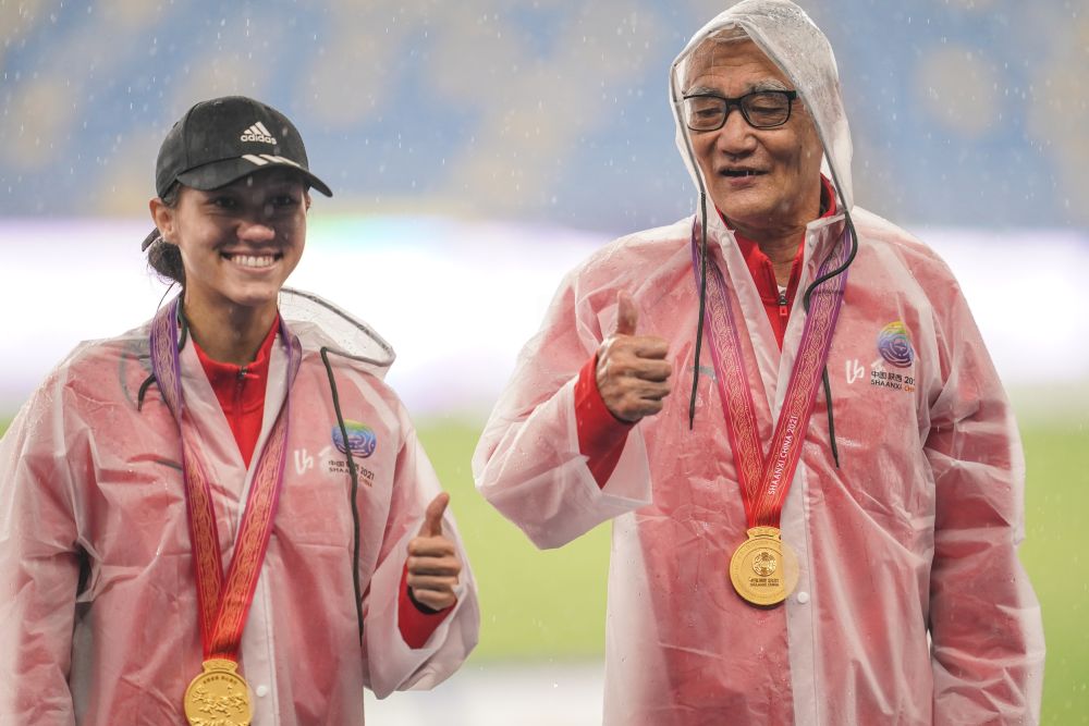 ↑ 2021年9月25日,山西队选手郑妮娜力(左)和外公兼教练段其炎在颁奖仪式上。当日,第十四届全运会田径项目女子七项全能比赛结束。山西队选手郑妮娜力以6026分的总成绩获得冠军。