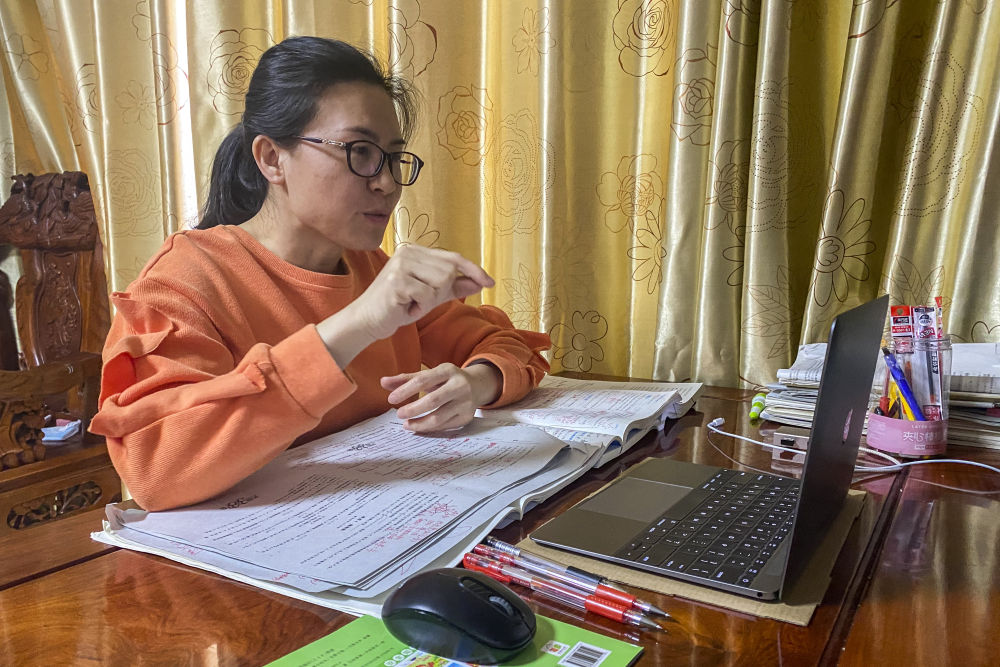 ↑1月5日晚,东兴中学一名家住疫情封控区的老师在家为高三学生上网课(受访者供图)。