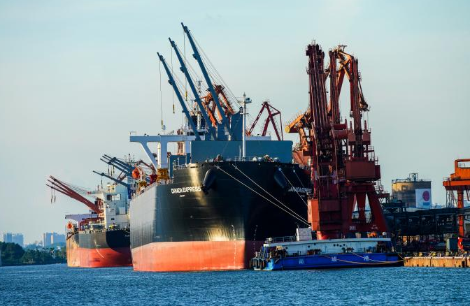 图为防城港码头上使用港口岸电的大型船舶