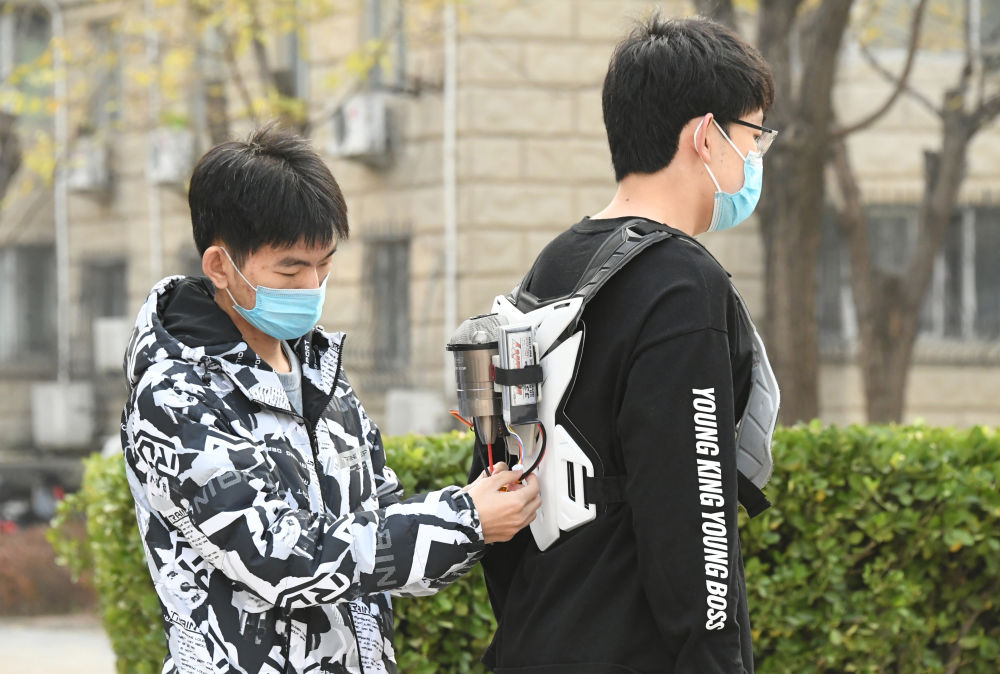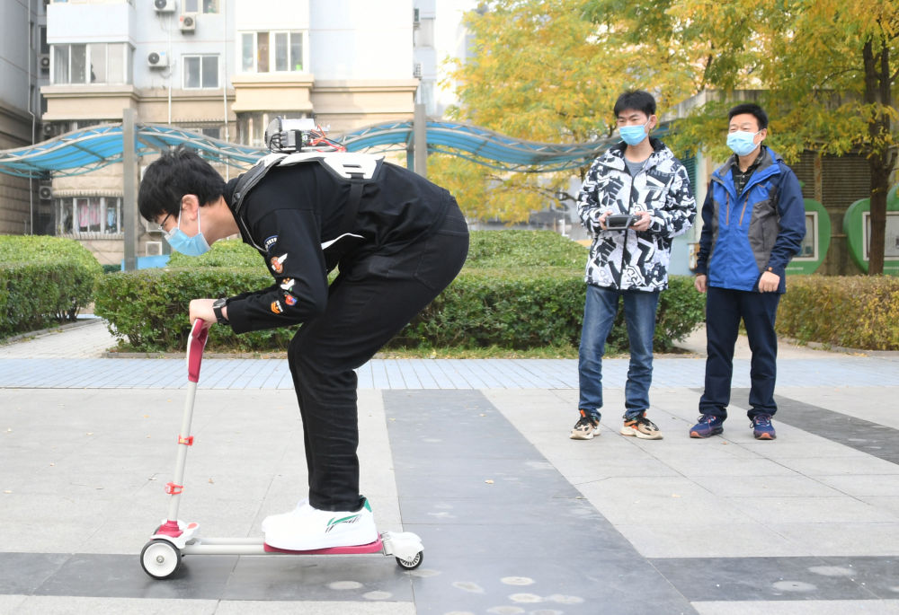 2021年11月3日,在北京航空航天大学学院路校区附近的一处空旷场地,柯鹏的硕士研究生刘畅飞(左)为张艺鸣穿戴助推器。新华社记者任超 摄