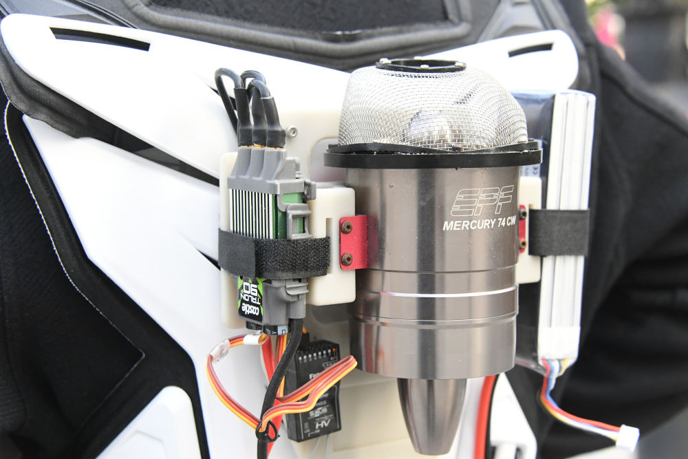 柯鹏与团队研发的助推器主要帮助运动员开展超速训练。“实验人员所背设备由常用于航空模型飞机的涵道风扇改造而成。”柯鹏说。