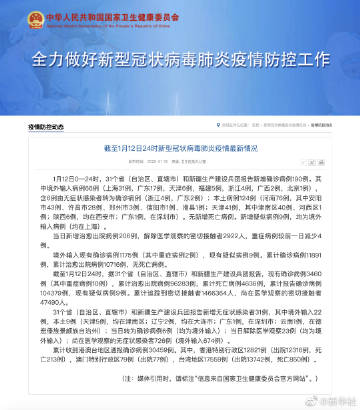 截至1月12日24时,据31个省(自治区、直辖市)和新疆生产建设兵团报告,现有确诊病例3460例(其中重症病例10例),累计治愈出院病例96283例,累计死亡病例4636例,累计报告确诊病例104379例,现有疑似病例9例。累计追踪到密切接触者1466364人,尚在医学观察的密切接触者47490人。