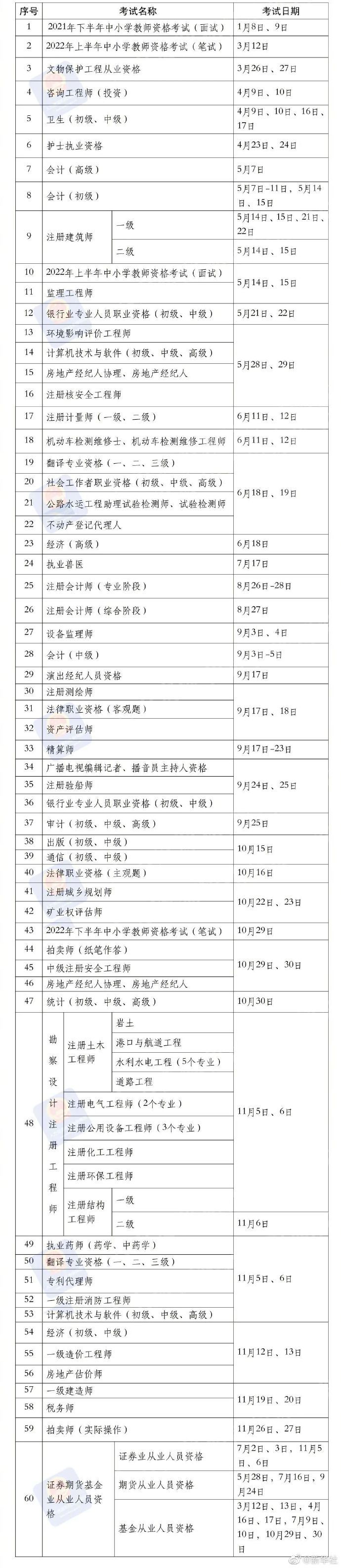 据新华社消息,人社部14日公布2022年度专业技术人员职业资格考试工作计划,包括中小学生教师资格、会计师、精算师、建造师等各项考试日期。其中,证券期货基金业从业人员资格各次考试地点不同,具体安排以相关行业协会考试公告为准。国家职业资格考试实行统一大纲、统一命题、统一组织,注意通过正规渠道报名。