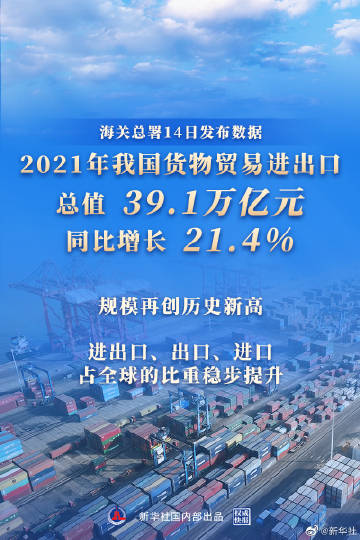 【权威快报|#2021年我国外贸额再创历史新高#】海关总署14日发布数据,2021年,我国货物贸易进出口总值39.1万亿元,同比增长21.4%,规模再创历史新高,实现量稳质升,稳外贸效果好于预期。(记者刘红霞,海报设计杨轶群)