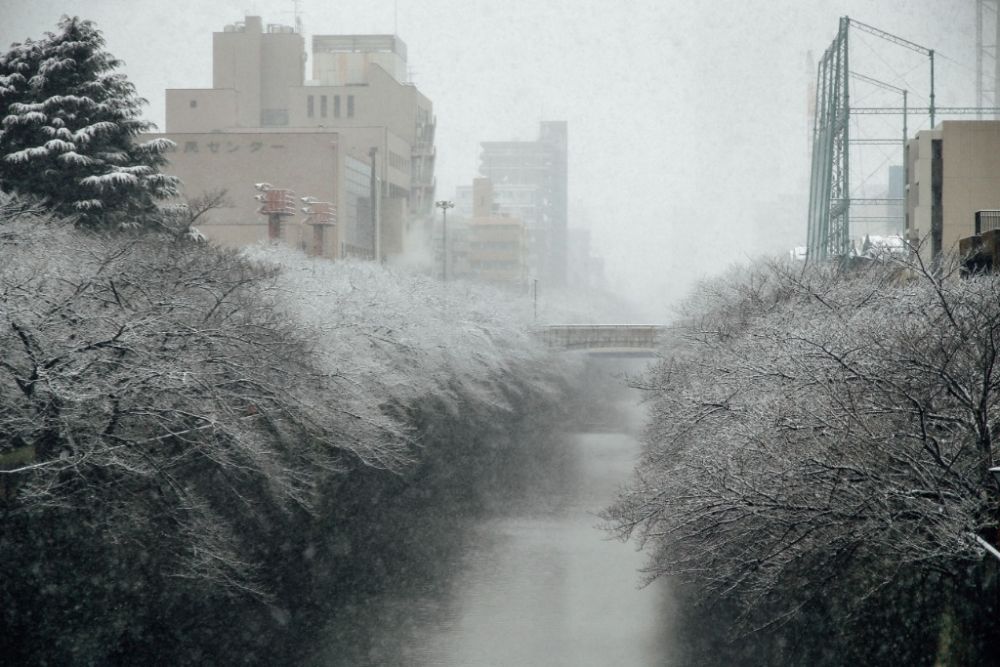 这是1月6日在日本东京拍摄的雪中目黑川。(新华社记者张笑宇摄)